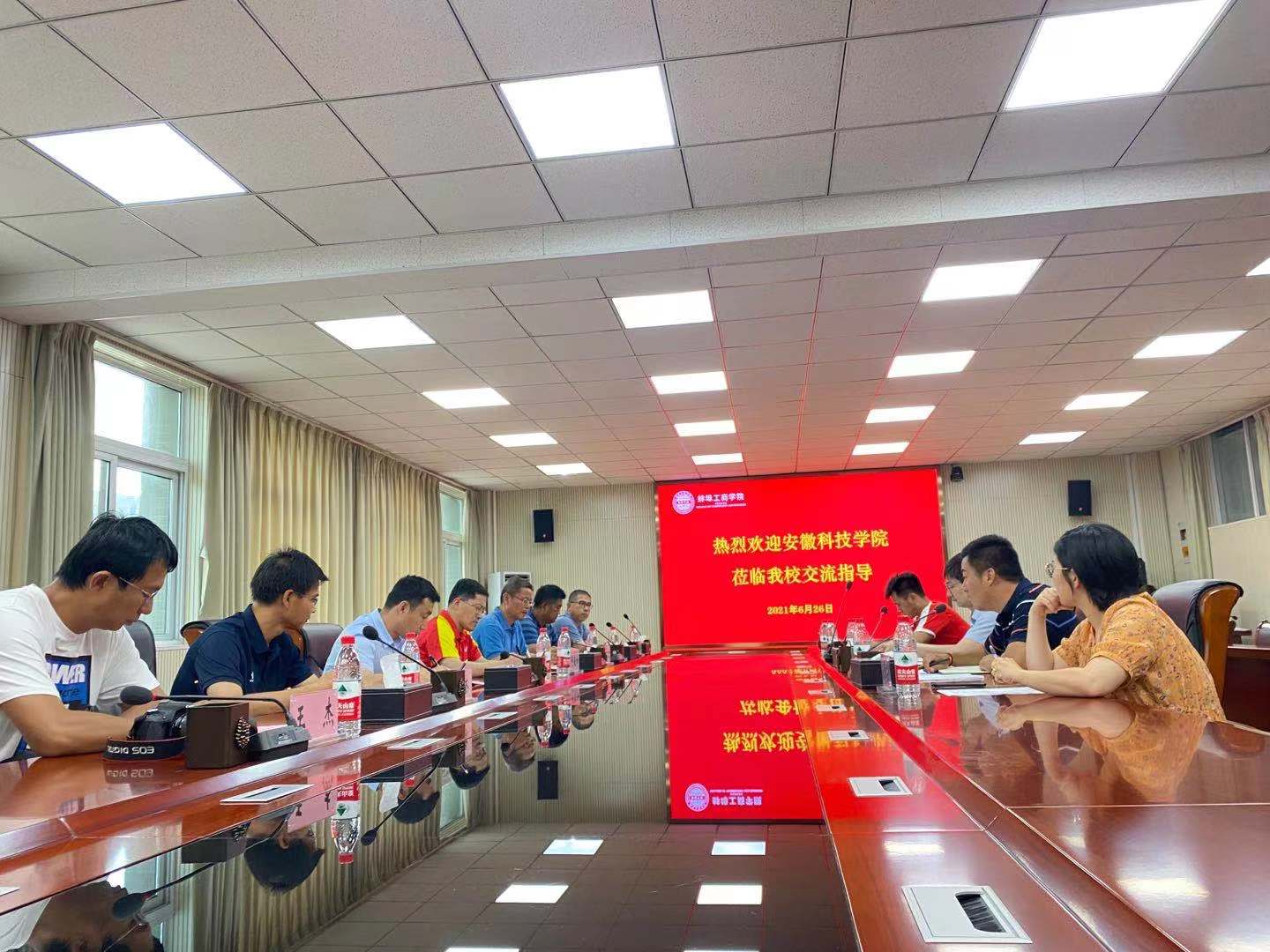 6月26日下午,安徽科技学院教务处副处长朱鹏程、体育教学部党总支书记何俊如、主任孙志双一行就体育教学相关工作赴我校进行交流指导,并举行了两校大学生男子足球队交流赛。我校教务处副处长李明、体育教学部主任景欣等人,于行远楼视频会议室对此次交流工作进行了接待。