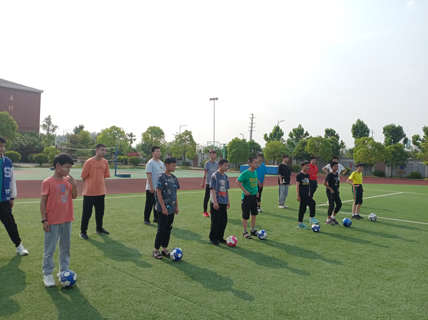 景老师首先通过一些踢球前热身动作的教学激发了同学们对足球这项运动的兴趣,同学们也积极地投入足球训练中,同时表现出了极高的运动天赋。